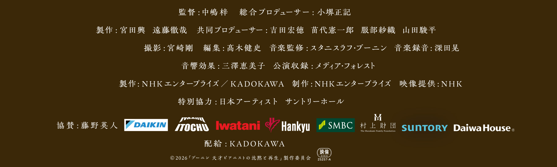 2025年12月サントリーホールの最新演奏を完全収録し、至高の音楽体験とともにブーニンの内面に深く迫る音楽ドキュメンタリーが誕生する。ともに復帰への道を歩んだ妻・榮子との絆、そして彼を敬愛してやまない著名ピアニストたちの証言を交えつつ、再生の旅路に寄り添い密着取材を続けた制作陣が、天才ピアニストが苦悩と葛藤の末に辿り着いた景色を描き出す。ブーニン自ら選び抜いた名曲の数々を収録。「人を感動させるa美しい演奏がしたい」と語る彼の珠玉の演奏をスクリーンで体感してほしい。