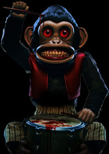 双子の少年ハルとビルは父が遺した持ち物から、ぜんまい式のドラムを叩く猿のおもちゃを見つける。その頃から周囲で“不慮の事故死”が相次いで起こりはじめる。最初はシッターのアニーが、ほどなくして母・ロイスが亡くなった。ハルはふたりが死ぬ前にこの猿がドラムを叩いていたことに関連があるのではないかと気味悪がっておもちゃを切り刻んで捨てるが、気づくと元通りとなって戻ってきた。