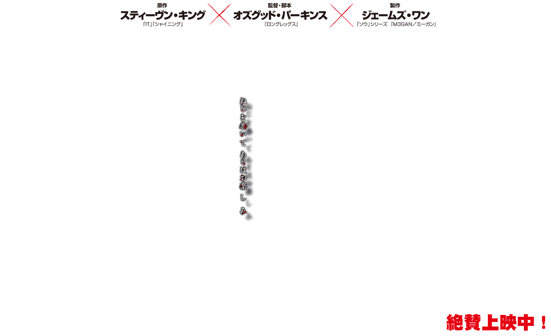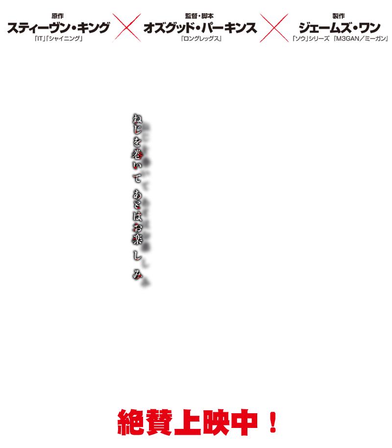 "ホラーの帝王"スティーヴン・キングの短編を基に、数々のヒット作を生み出してきたジェームズ・ワンがプロデュース、日本でも高い評価を得た『ロングレッグス』のオズグッド・パーキンスが監督と脚本を務め映画化。本国アメリカでは、米アカデミー賞作品賞受賞の『ANORA アノーラ』など話題作を配給するNEONによって今年2月に公開。公開前から予告編の再生回数が72時間で1億900万回を超え、インディーホラーとして最高記録を更新(アメリカ2025/1/24時点)するなど大変な話題となり、『キャプテン・アメリカ:ブレイブ・ニュー・ワールド』に次いで2位のオープニング成績で大ヒット。