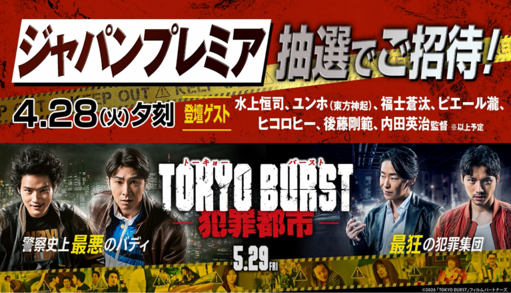 このたび、映画『TOKYO BURST-犯罪都市-』舞台挨拶付き本編上映イベント「ジャパンプレミア」の開催が決定!特設ページより応募いただいた方から抽選でペアご招待いたします!