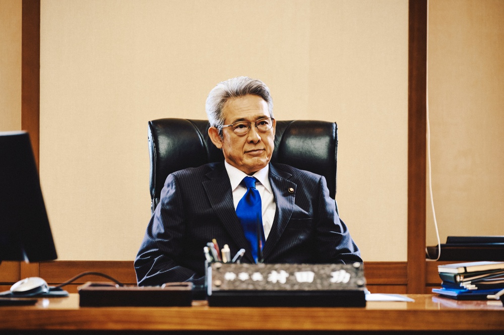 さらに、堂々たる姿で鎮座するのは鶴見辰吾演じる民和党・幹事長。国家レベルの陰謀を操る黒幕の風格を感じさせるカットとなっています。また、白のタンクトップに刺青が一際目立つ屈強な男は後藤剛範演じる岩城組の若頭ですが、刃物を突きつけられても表情を微軽も変えない様子に組織の強靭さが窺えます。